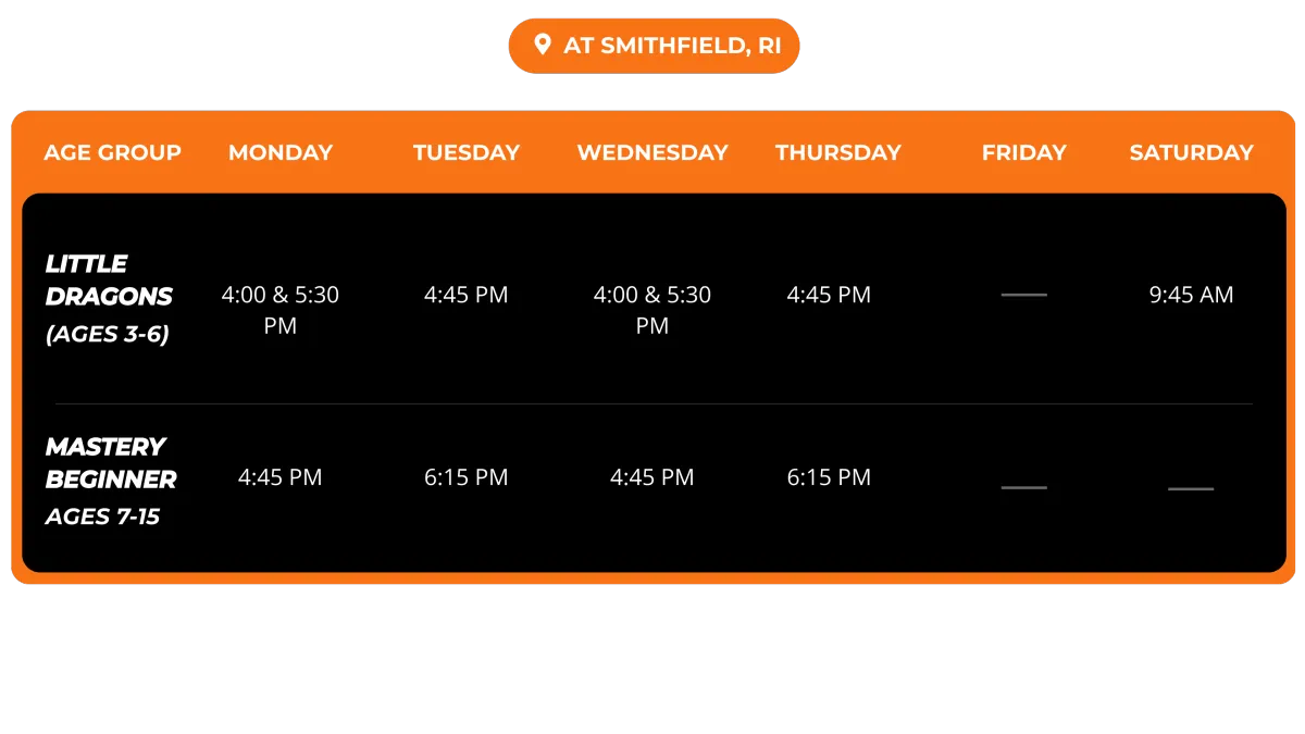 Yes. Our Smithfield academy is built for both emotional and physical safety. Classes are structured, instructors connect with every child, and we coach kids through challenges with support, never shame.